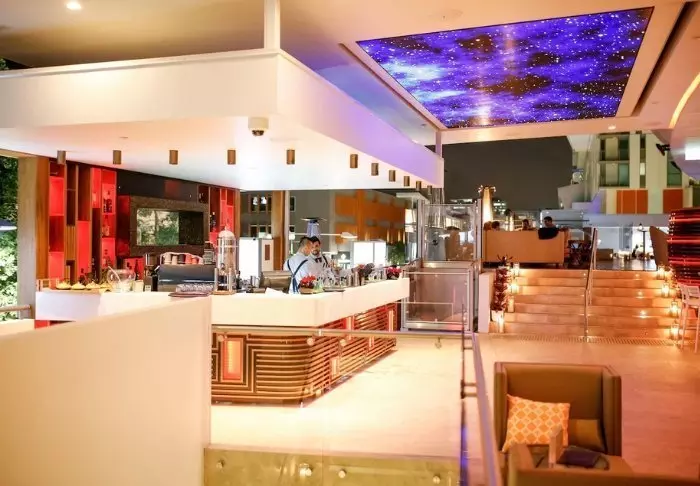 U vindt het restaurant op de begane grond en het zwembad op de derde verdieping, gedeeltelijk onder open hemel.