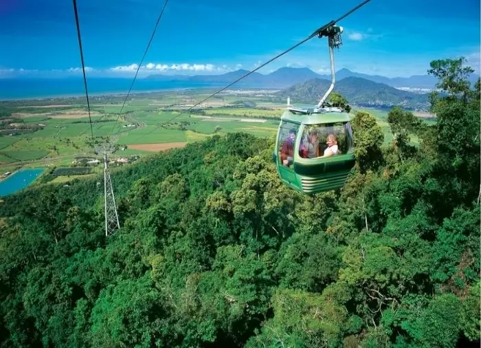 De terugreis naar Cairns is met Skyrail – een kabelbaan waarmee u langzaam over de boomtoppen terug naar de stad glijdt.