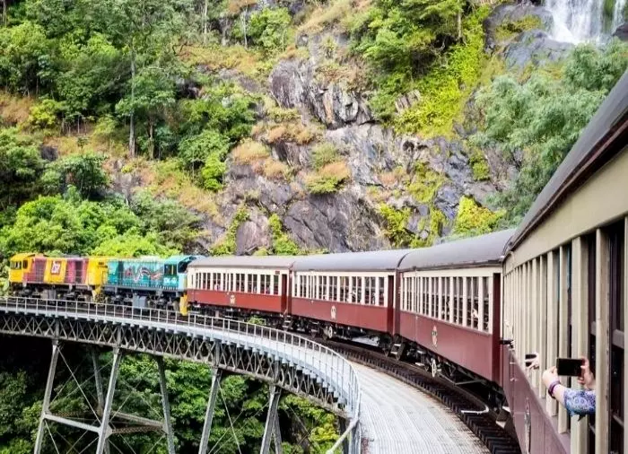 De treinreis van Cairns naar Kuranda is vandaag de dag misschien wel een van de mooiste treinreizen ter wereld. Vanuit Cairns klimt de 100 jaar oude, gerestaureerde trein tot 327 meter boven zeeniveau. De trein passeert 15 tunnels en 37 bruggen en onderweg heeft u uitzicht op regenwoud en watervallen. De treinreis duurt 3 uur – ontspan en geniet van de reis!