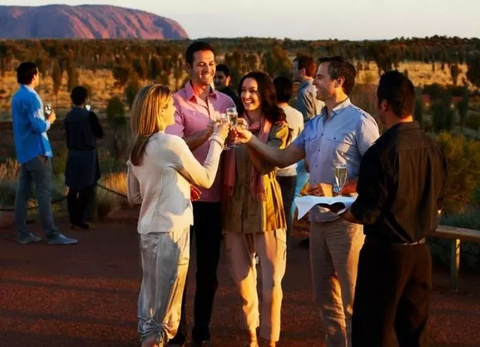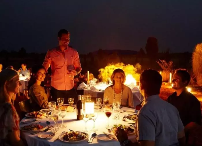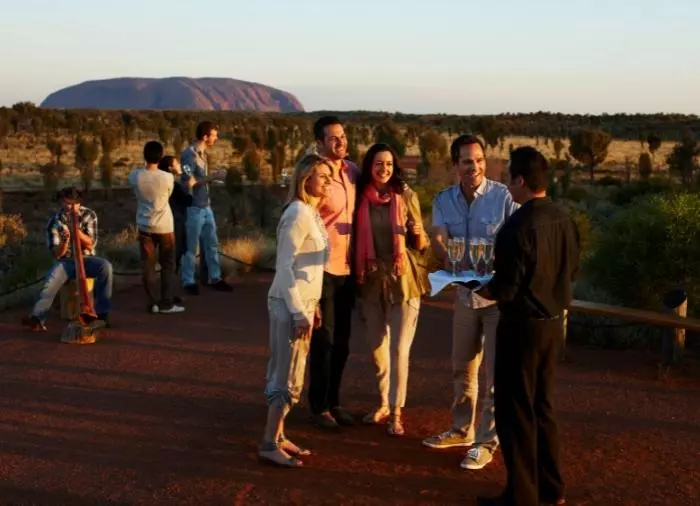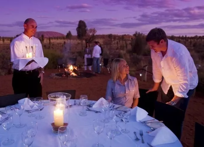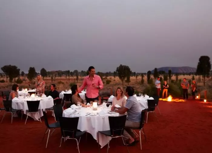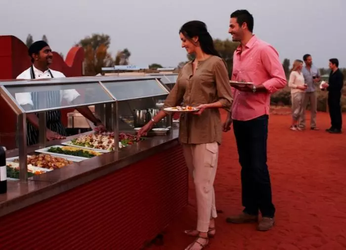 Geniet van een diner onder de sterren bij het bekroonde Sounds of Silence Restaurant. Midden in de Australische woestijn wordt u verwelkomd met een glaasje bubbels. Het geluid van een didgeridoo klinkt op de achtergrond als de zon langzaam ondergaat over Uluru. Als de duisternis is gevallen, bieden uw gastvrouwen/gastheren u een heerlijke Australische barbecue zodat u interessante Australische specialiteiten kunt proeven. Het diner wordt geserveerd als buffet en wordt gegeten aan grote tafels met ca. 10 gasten aan elke tafel. Daarna vertelt een astronoom over de machtige sterrenhemel boven uw hoofd.