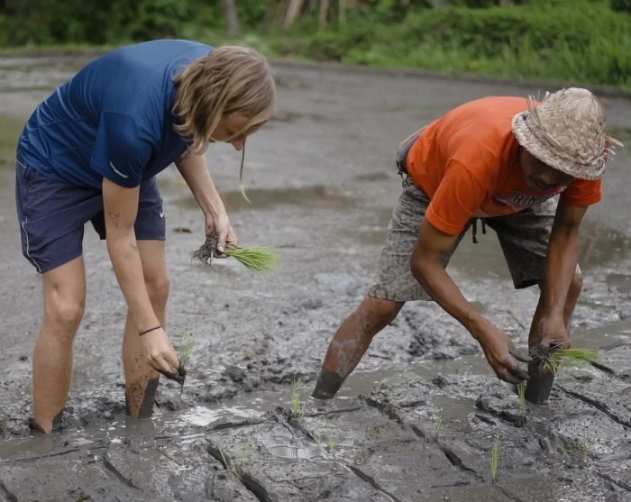 Afhankelijk van het seizoen kunt u meewerken op het land. Tijdens het planten doet u uw schoenen uit en stapt u in de zachte modder, terwijl de boer laat zien hoe u de jonge rijstplantjes zet en achterwaarts beweegt om ze ruimte te geven om te groeien. In het oogstseizoen staan de velden goudgeel klaar, en u ziet hoe de rijst met de hand en met sikkels wordt geoogst, verzameld en gedorst om de kwaliteit te behouden. Wanneer de rijstplanten groeien, helpt u ze verzorgen met organische mest die direct op de boerderij wordt geproduceerd.