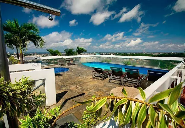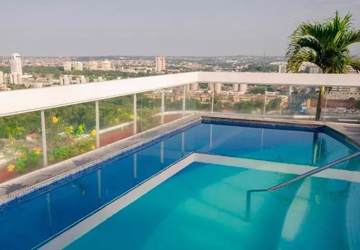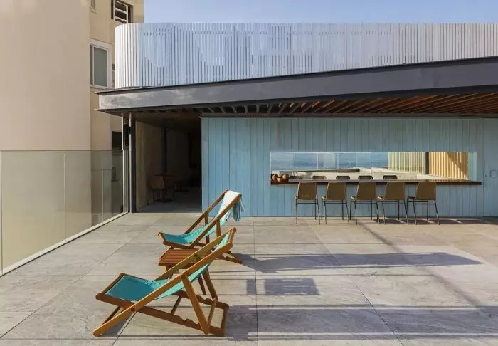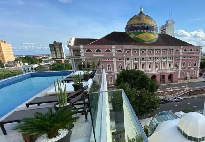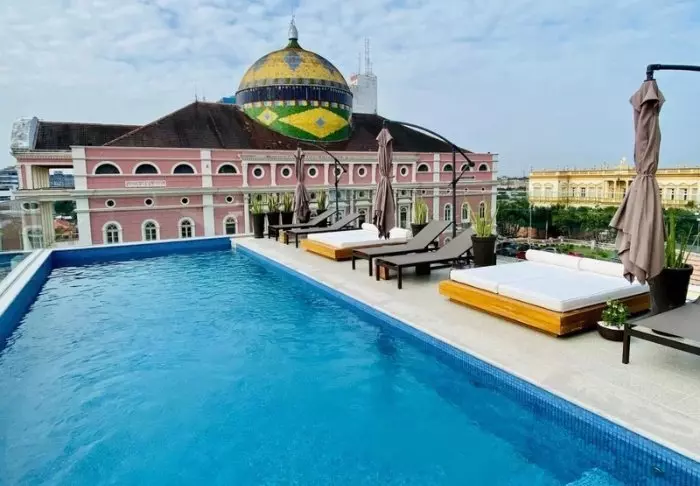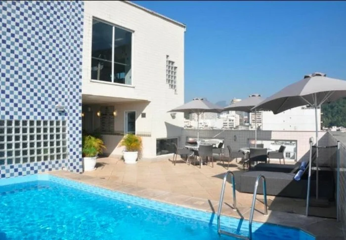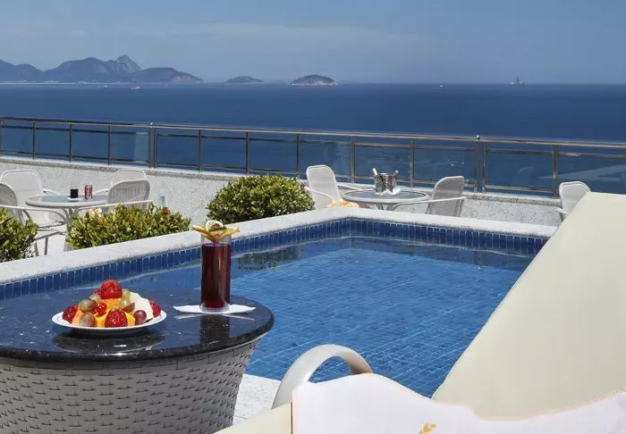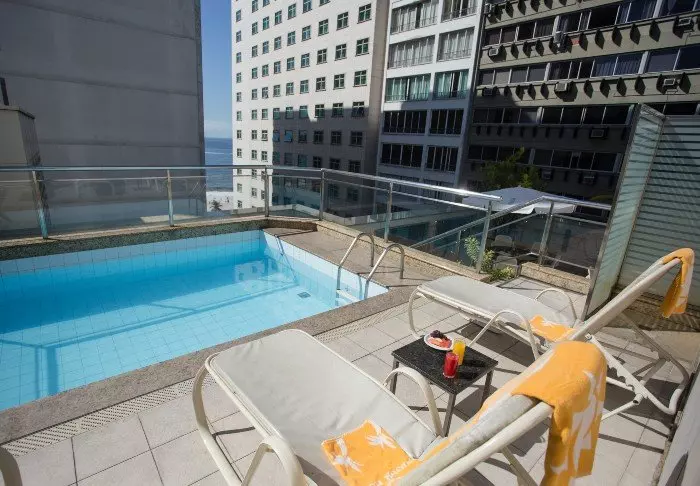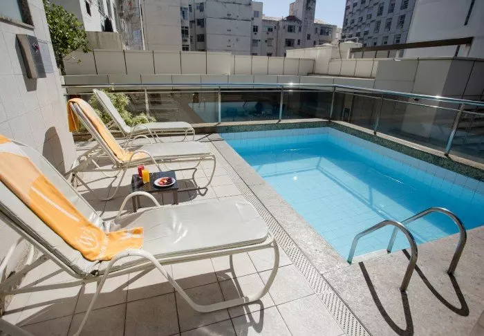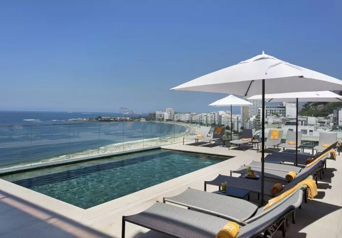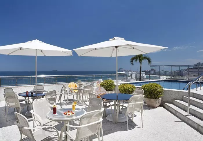 Het zwembad van het hotel bevindt zich ook op de bovenste verdieping, waar je kunt zwemmen in het zwembad of ontspannen in een ligstoel met uitzicht op Copacabana.