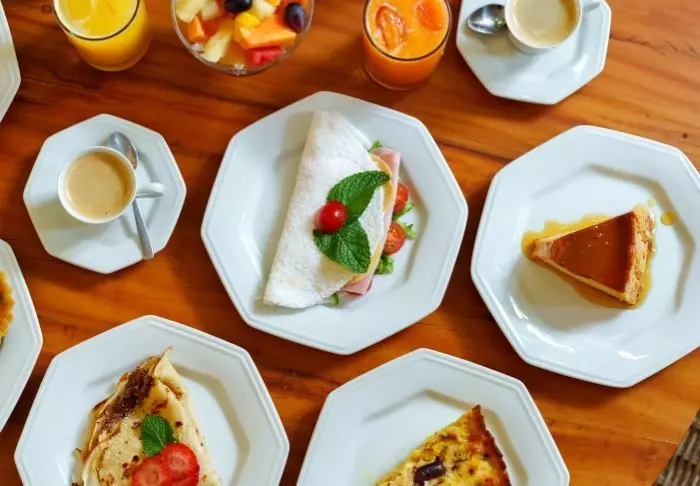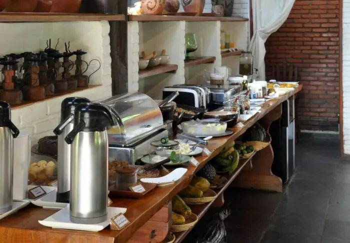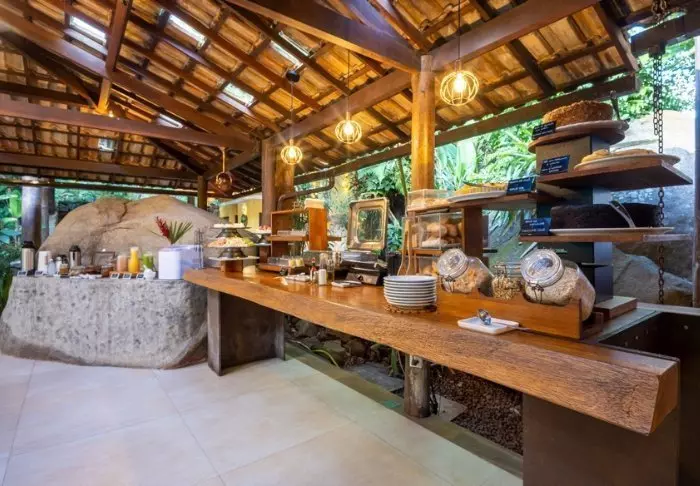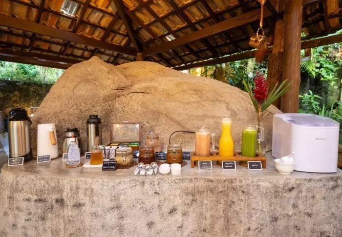 Het ontbijt wordt op het gewenste tijdstip op de kamer geserveerd en bestaat uit huisgemaakt brood, fruit en lokale lekkernijen, zoals tapiocapannenkoeken.