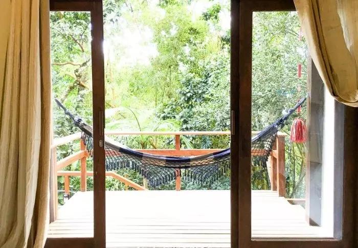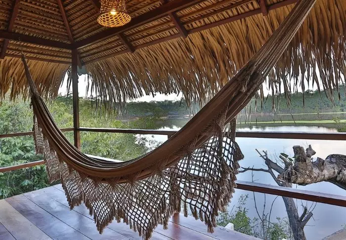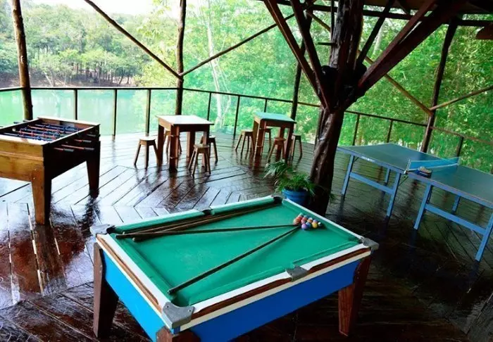 In een gemeenschappelijke bungalow met hangmatten kun je ontspannen na je jungle avonturen en genieten van een drankje uit de lobbybar. Er is ook een selectie boeken en bordspellen beschikbaar voor gebruik.