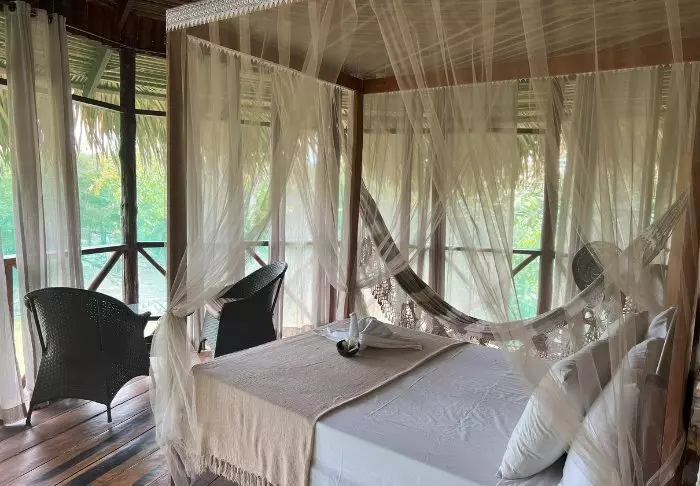 Samen met je gids en andere gasten van de lodge maak je een wandeling van 15 minuten de jungle in totdat je het gebied bereikt waar het kamp voor de nacht wordt opgezet. Hier hang je je meegeleverde hangmat en klamboe op onder een zeil, waar je de nacht doorbrengt. Je krijgt ook een deken voor de nacht.