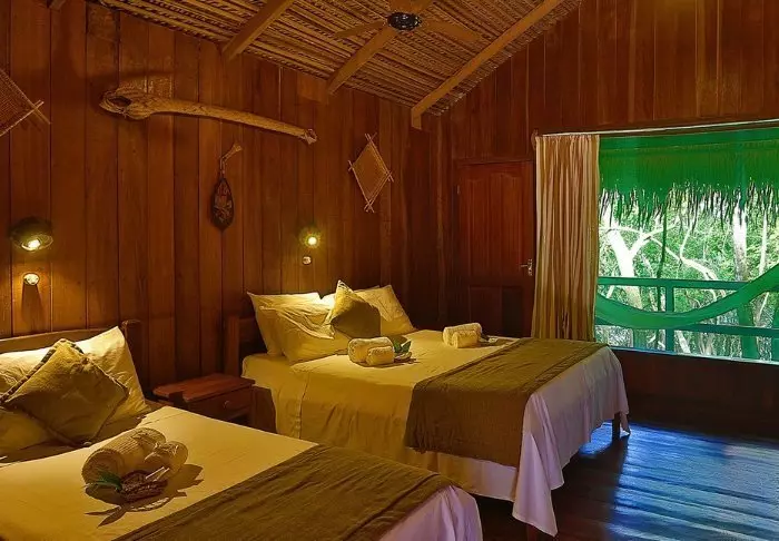 Bij aankomst in de lodge krijg je een verfrissend welkomstdrankje aangeboden en wordt je kamer toegewezen. De lodge heeft slechts 18 rustieke kamers en de sfeer is gezellig en gastvrij. De kamers zijn gebouwd van hout uit de omgeving, wat goed harmonieert met de omringende natuur. De kamers zijn eenvoudig ingericht, maar mooi en schoon, en ze hebben alles wat je nodig hebt; een bed, plafondventilator en een en-suite badkamer met op natuurlijk wijze verwarmd water. Bovendien zijn de ramen voorzien van horren, hoewel door de hoge pH-waarde in de rivier de Tupana muggen zich moeilijk kunnen voortplanten, waardoor muggen hier het grootste deel van het jaar geen probleem vormen.