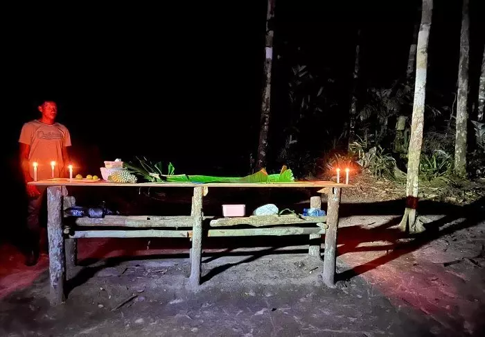 In de avond bereid je samen het avondeten boven een kampvuur, dat op bananenbladeren wordt geserveerd.