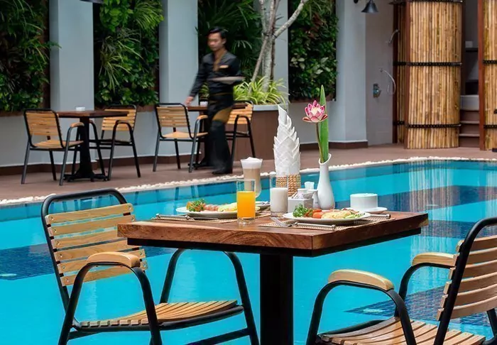 Naast het zwembad vindt u het restaurant en de bar van het hotel. Het restaurant biedt buffet en à la carte met gerechten uit de internationale en de Cambodjaanse keuken, terwijl de bar bier, wijn, bubbels en kleurrijke cocktails biedt.