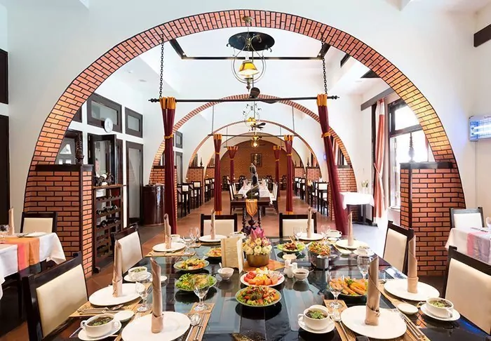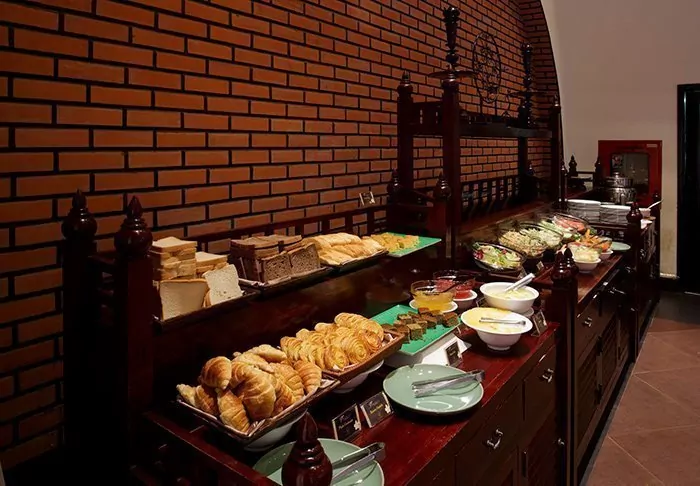 In het restaurant van het hotel, met uitzicht op het zwembad, worden ‘s ochtends, ‘s middags en ‘s avonds Aziatische en westerse gerechten geserveerd.