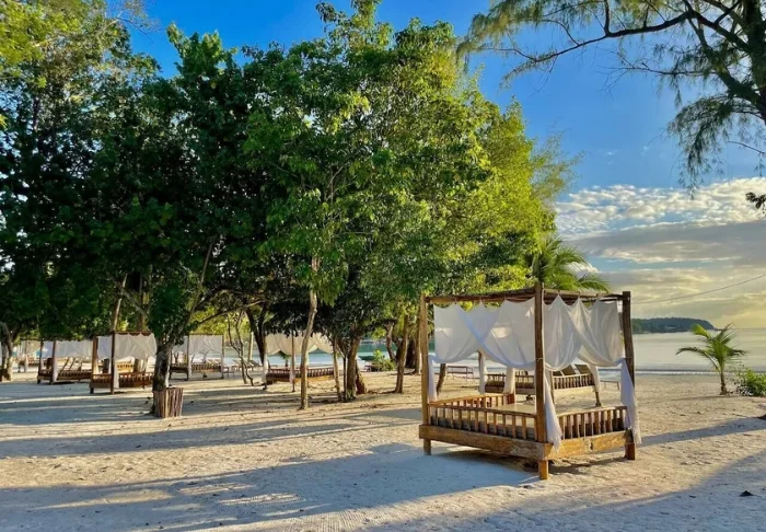Island Center Point ligt pal aan het witte zandstrand van de rustige Saracen Bay op Koh Rong Sanloem en vormt zo een ontspannen decor voor uw verblijf op een van Cambodja’s meest sfeervolle eilanden. Met de zee voor de deur combineert u strandtijd gemakkelijk met rustige wandelingen langs de baai, waar eenvoudige strandbars en lokale restaurants verspreid langs de waterlijn liggen.
