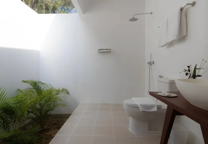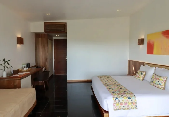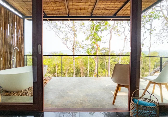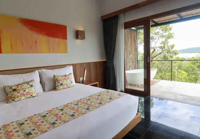 Standaard verblijft u in een Deluxe Hillside-kamer van 52 m2. Iets teruggetrokken en hoger gelegen in het weelderige groen achter het strand geniet u hier van een rustige, intieme ligging. U bereikt de kamer via trappen door het glooiende terrein en wordt getrakteerd op een prachtig uitzicht, hoewel u ook met een buggy naar de kamer kunt gaan. Binnen zetten warme houttinten, veel licht en een ontspannen sfeer de toon, terwijl grote schuifdeuren direct op een ruim terras uitkomen met een badkuip en uitzicht over het bos en Saracen Bay aan de horizon. Er is volop ruimte voor twee en u slaapt in een groot tweepersoonsbed of in twee eenpersoonsbedden – ideaal voor lange, onthaaste ochtenden. De kamer is uitgerust met airconditioning, wifi, een minibar, koffie- en theefaciliteiten en een bureau. De badkamer is gedeeltelijk open, waardoor u dichter bij de natuur bent. U beschikt over zowel een bad als een aparte douche.