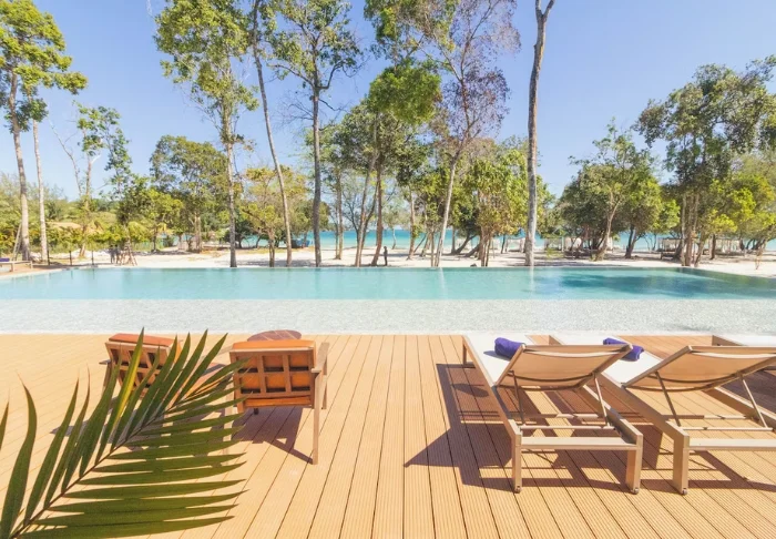 Het hotel biedt diverse faciliteiten die perfect aansluiten bij de ontspannen vakantiesfeer. Aan het strand vindt u het fijne zwembad van het hotel, ideaal voor een verfrissende duik of om simpelweg te ontspannen met uitzicht over de baai. Er zijn ook activiteiten zoals suppen en beachvolleybal, en achter het resort kunt u korte wandelingen maken door het groen. Zin in wat extra verwennerij? Boek dan massages en spabehandelingen, op het strand of in uw eigen kamer.