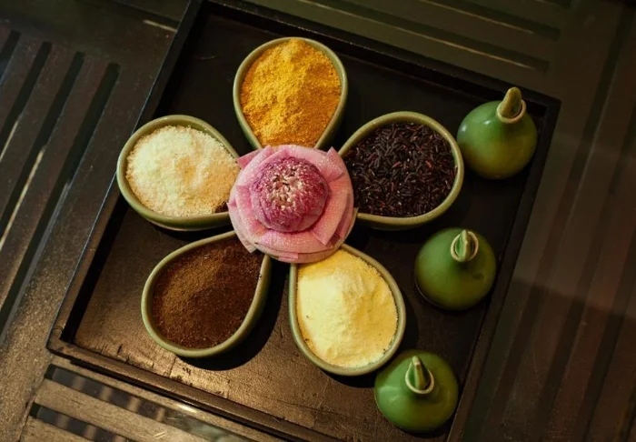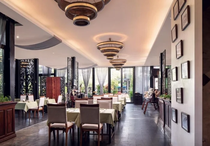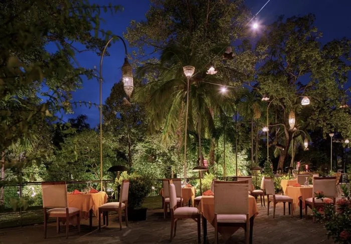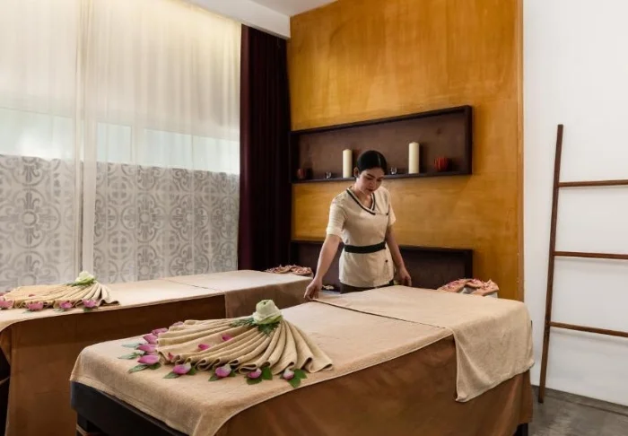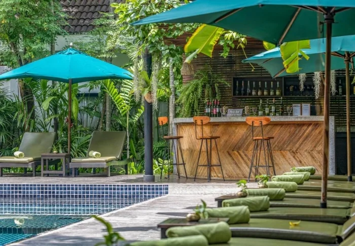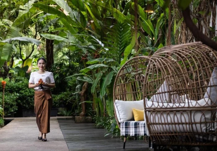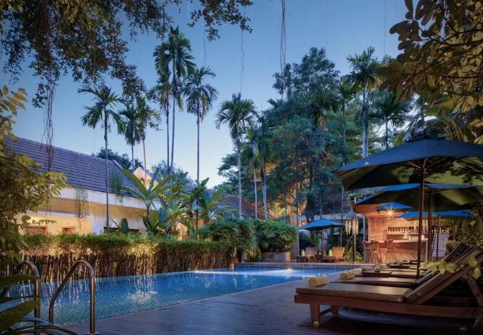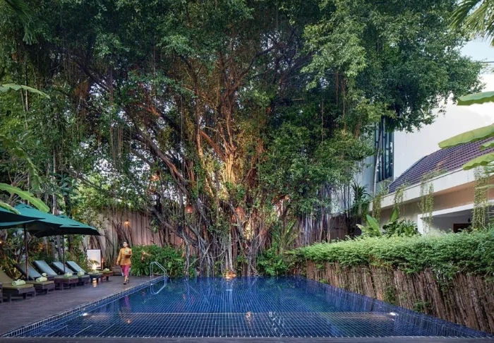 Midden in de weelderige binnenplaats ligt het zwembad van het hotel, omgeven door hoge bomen en dicht groen. Hier is volop ruimte voor een verfrissende duik of om in de schaduw tot rust te komen na een dag vol tempelbezoeken en stadsavonturen. Wie behoefte heeft aan extra verwennerij, kan terecht in de spa, waar behandelingen worden aangeboden die geïnspireerd zijn op lokale tradities.