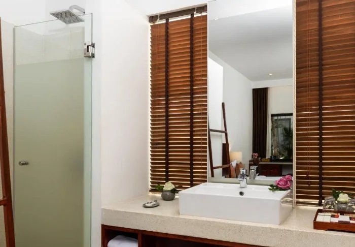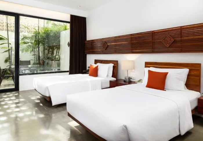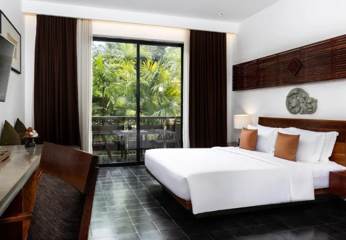 Het resort beschikt over in totaal 46 kamers en u verblijft standaard in een deluxe kamer met uitzicht op de weelderige tuinen. De kamer is licht en ruim, met grote ramen die het groen naar binnen halen en vanuit het bed een prachtig uitzicht bieden. De inrichting is eenvoudig maar sfeervol, met donkerhouten meubilair, details geïnspireerd op de Khmer-stijl en rustgevende aardetinten. Elke kamer is voorzien van een bureau, airconditioning, gratis wifi, flatscreen-TV, minibar, kluisje en faciliteiten voor koffie en thee. De badkamer beschikt over een regendouche, zachte badjassen, slippers en gratis toiletartikelen. Bovendien heeft elke kamer een eigen terras of balkon – de ideale plek om de dag rustig te beginnen.