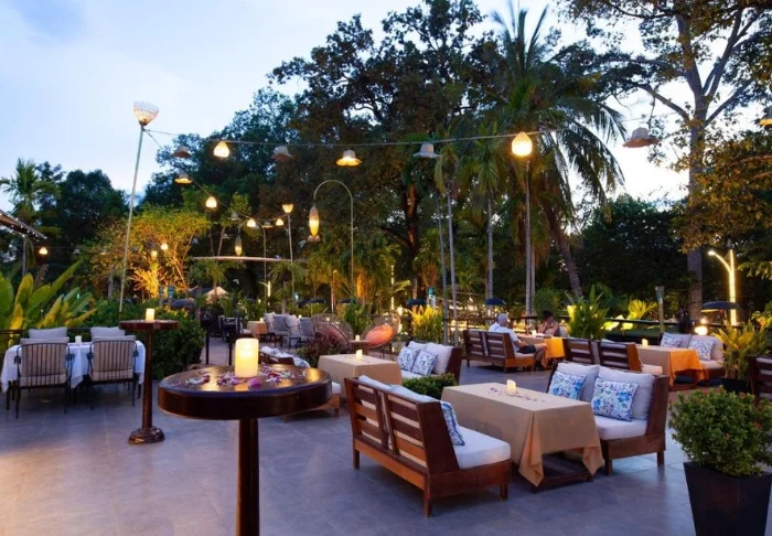 Het restaurant serveert zowel Cambodjaanse gerechten als internationale favorieten in een informele, ontspannen sfeer die perfect aansluit bij de vakantiesfeer.