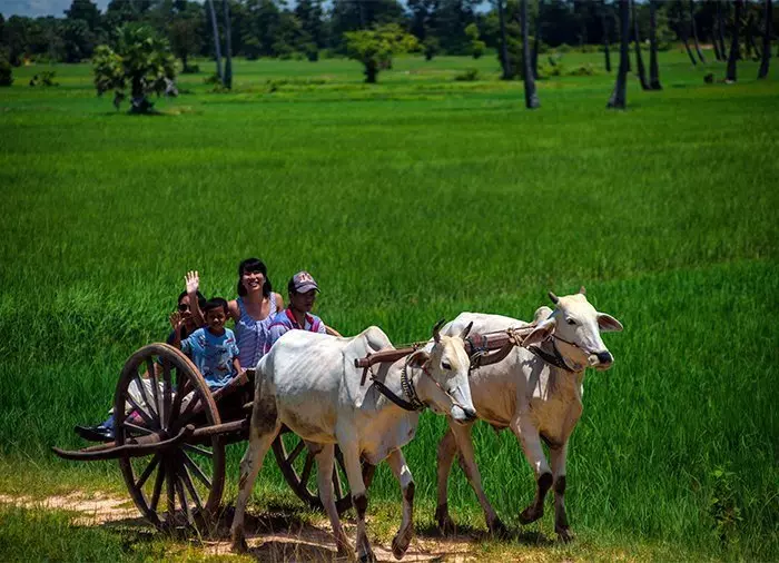 De boot vaart door naar het dorpje Chansar. Hier stapt u van de boot over in een ossenwagen en maakt u een leuke, hobbelige rit door de velden naar een Khmer-familie, die kost verdient met het maken van bezems. U krijgt te zien hoe de bezems worden gemaakt en mag ook zelf meedoen aan het maken van een bezem.