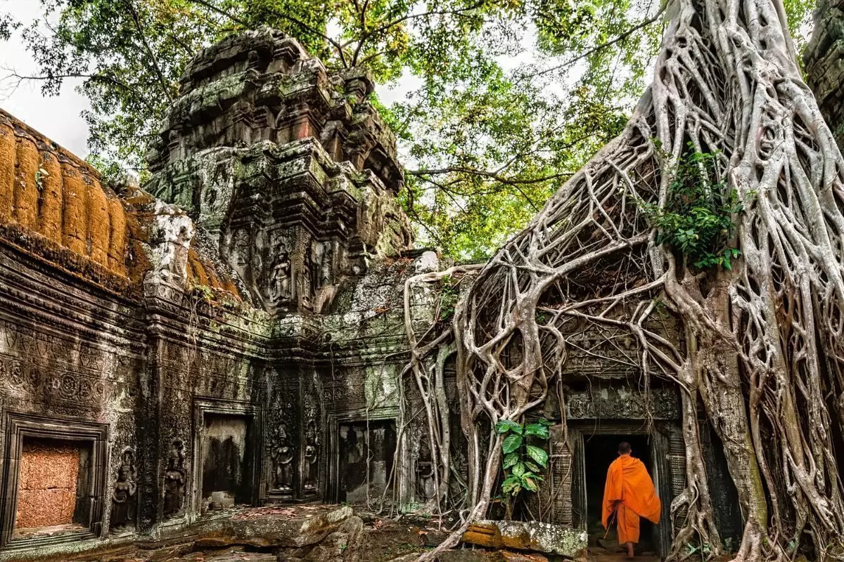 Tenslotte bezoekt u de beroemde en unieke Ta Prohm tempel, die heel bijzonder is omdat prachtige grote bomen wortel hebben geschoten in de tempelgebouwen, waardoor het lijkt alsof ze zijn samengesmolten.