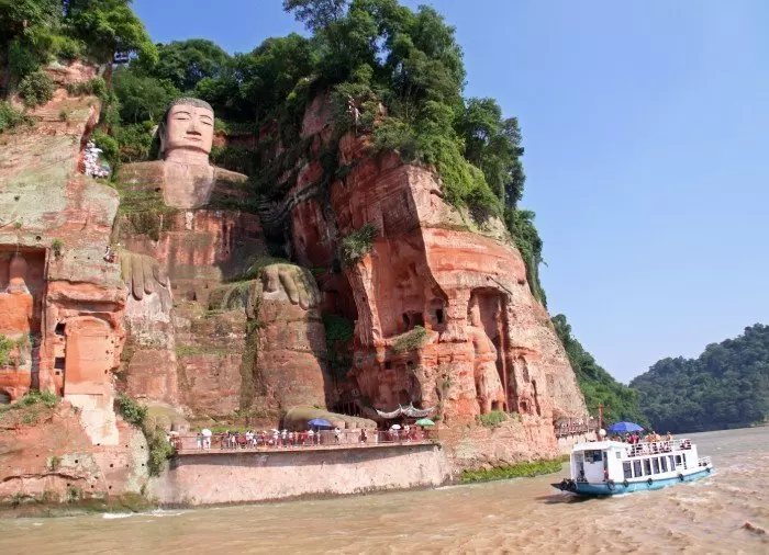 De Grote Boeddha is uitgehouwen in een rots van rood zandsteen, precies daar waar de Dadu, Minjiang en Qingyi rivieren samenvloeien. Volgens de Chinese vertelling verdwenen hier veel schepen spoorloos in de draaikolken, omdat het water bij de samenvloeiing erg onrustig was. Een monnik genaamd Hai Tong stelde daarom voor om een gigantische zittende Boeddha te bouwen om de schepen te beschermen en de kwaadaardige riviergoden tot rust te manen. Jarenlang vroeg hij om geld om voor het project, dat werd gestart tijdens de Tang-dynastie in 713. Helaas stierf de monnik toen het project half af was. Na zijn dood liep het project vast wegens gebrek aan financiering. Pas 70 jaar later besloot de lokale gouverneur Wei Gao het project te sponsoren en werd het standbeeld in 803 voltooid.