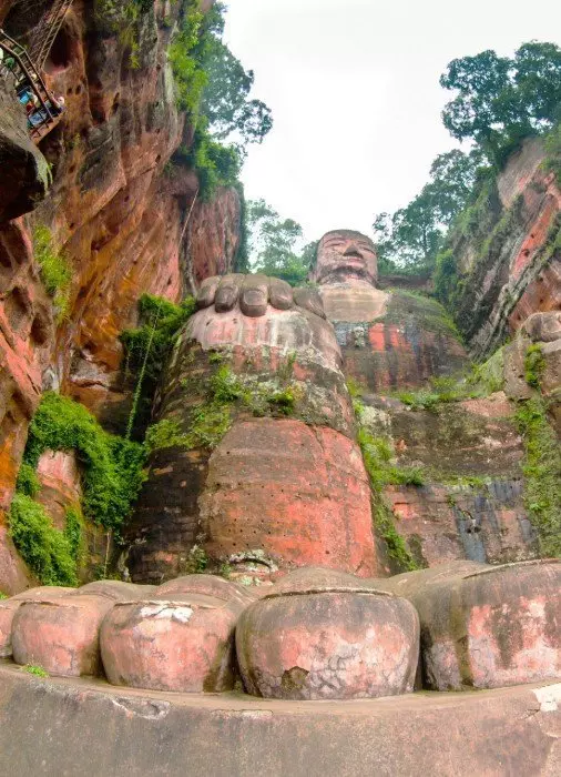 U komt aan bij een uitzichtplatform waar u bijna oog in oog staat met de Boeddha, die een hoogte heeft van 71 meter en een breedte van 28 meter. Vanaf hier kunt u de 1.021 fijn uitgehouwen haarbundels bewonderen. Een smalle stenen trap van 217 treden leidt langs de zijkant van de Boeddha en helemaal naar beneden naar de voeten. Onderweg kunt u het indrukwekkende standbeeld van verschillende kanten bewonderen. De grootte van de Boeddha is echt verrassend – het hoofd is 14,7 meter, de vingers zijn 8,3 meter, alleen al de nagels zijn groter dan een gemiddeld mens, en de voeten zijn 11 meter lang. Het standbeeld is echt indrukwekkend en overweldigend!