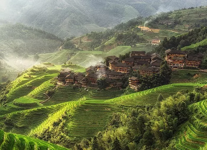 Ping’an is beroemd vanwege de prachtige ligging midden in de prachtige rijstterrassen van Longji, die zich uitstrekken tot zover het oog reikt. Longji betekent ‘rug van de draak’, en dat is precies hoe de heuvelachtige rijstterrassen eruit zien. Het is niet moeilijk te begrijpen waarom deze rijstterrassen worden beschouwd als de mooiste ter wereld, en waarom ze dichters, fotografen en toeristen van heinde en verre aantrekken. Ze zijn gigantisch, betoverend en indrukwekkend! Lang geleden waren het de voorouders van de Zhuang die deze terrassen hebben aangelegd. Ze liggen tegen de steile berghellingen aan op een hoogte van 300-1100 meter.