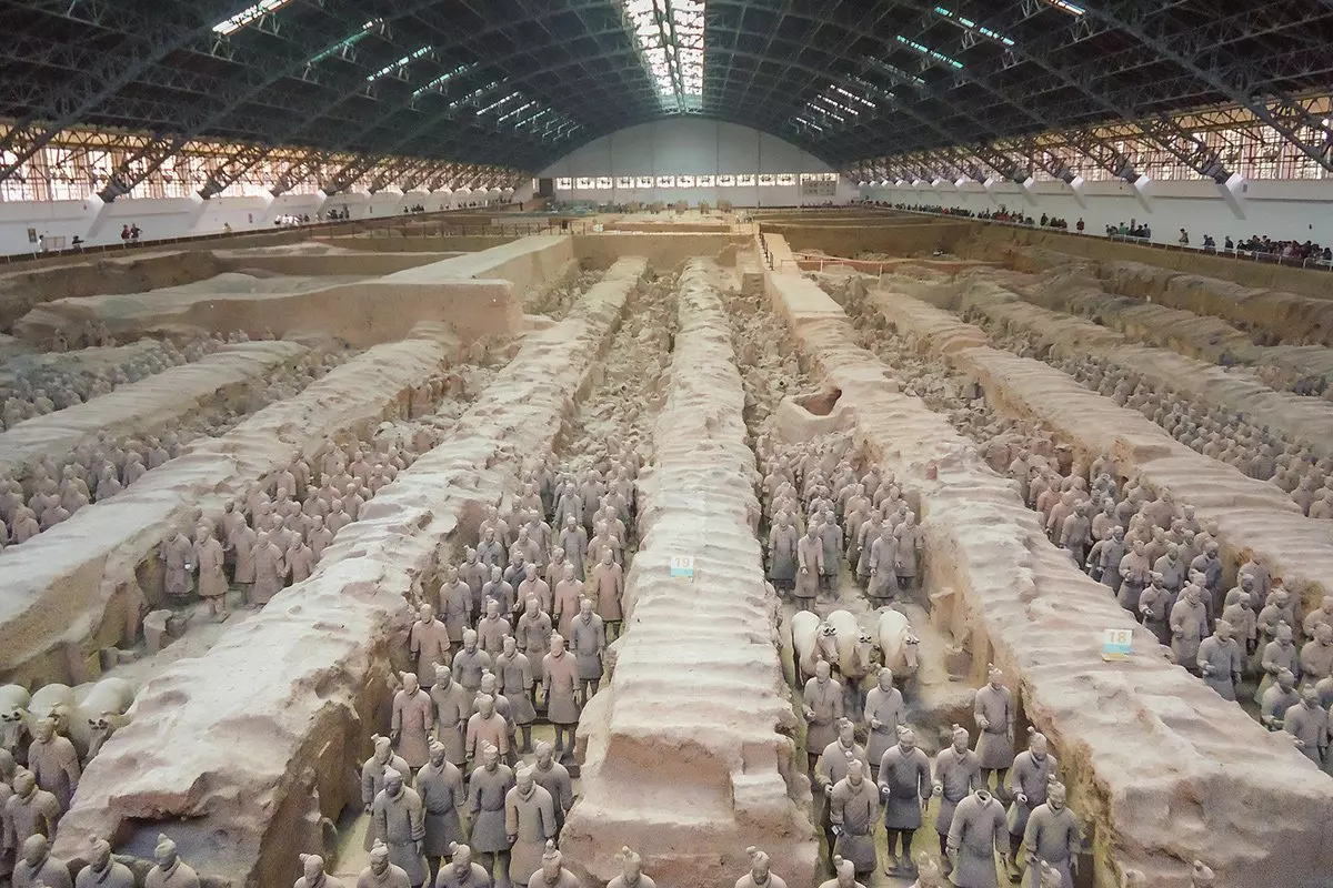 In 1974 vonden plaatselijke boeren, die aan het werk waren op het land, fragmenten van een beeld dat net zo groot was als een mens. Archeologen zetten de opgravingen voort, en dit resulteerde in de grootste vondst ter wereld van ondergrondse beelden. Bij de opgravingen werden meer dan 7.000 terracotta krijgers, paarden en strijdwagens gevonden. De krijgers zijn tussen de 175 en 190 cm lang en geen twee krijgers zijn hetzelfde. Ze hebben allemaal verschillende kleding, verschillende kapsels en verschillende gelaatstrekken. De krijgers stonden opgesteld bij het graf van keizer Qin Shi Huang. Men denkt dat de krijgers zijn gemaakt om hun heerser te beschermen in het hiernamaals.