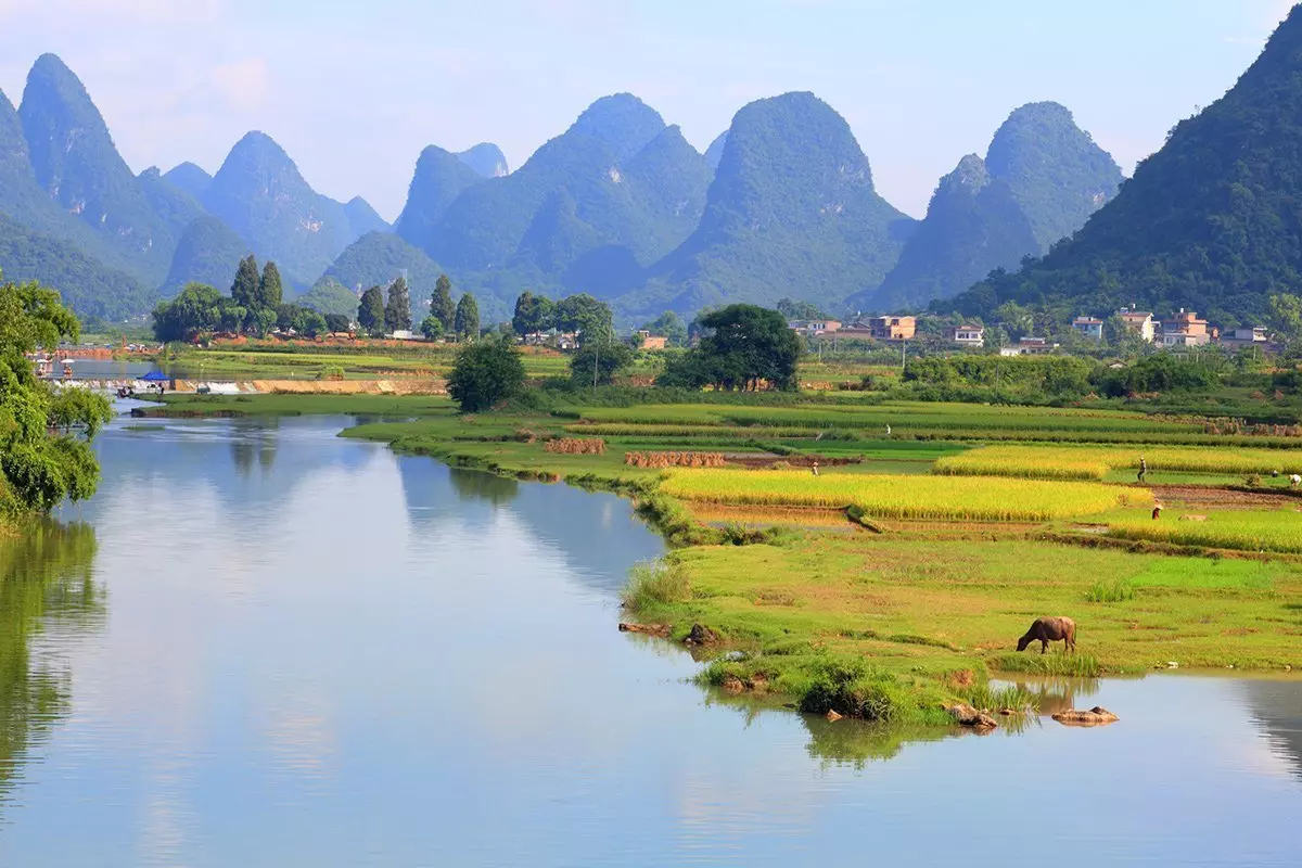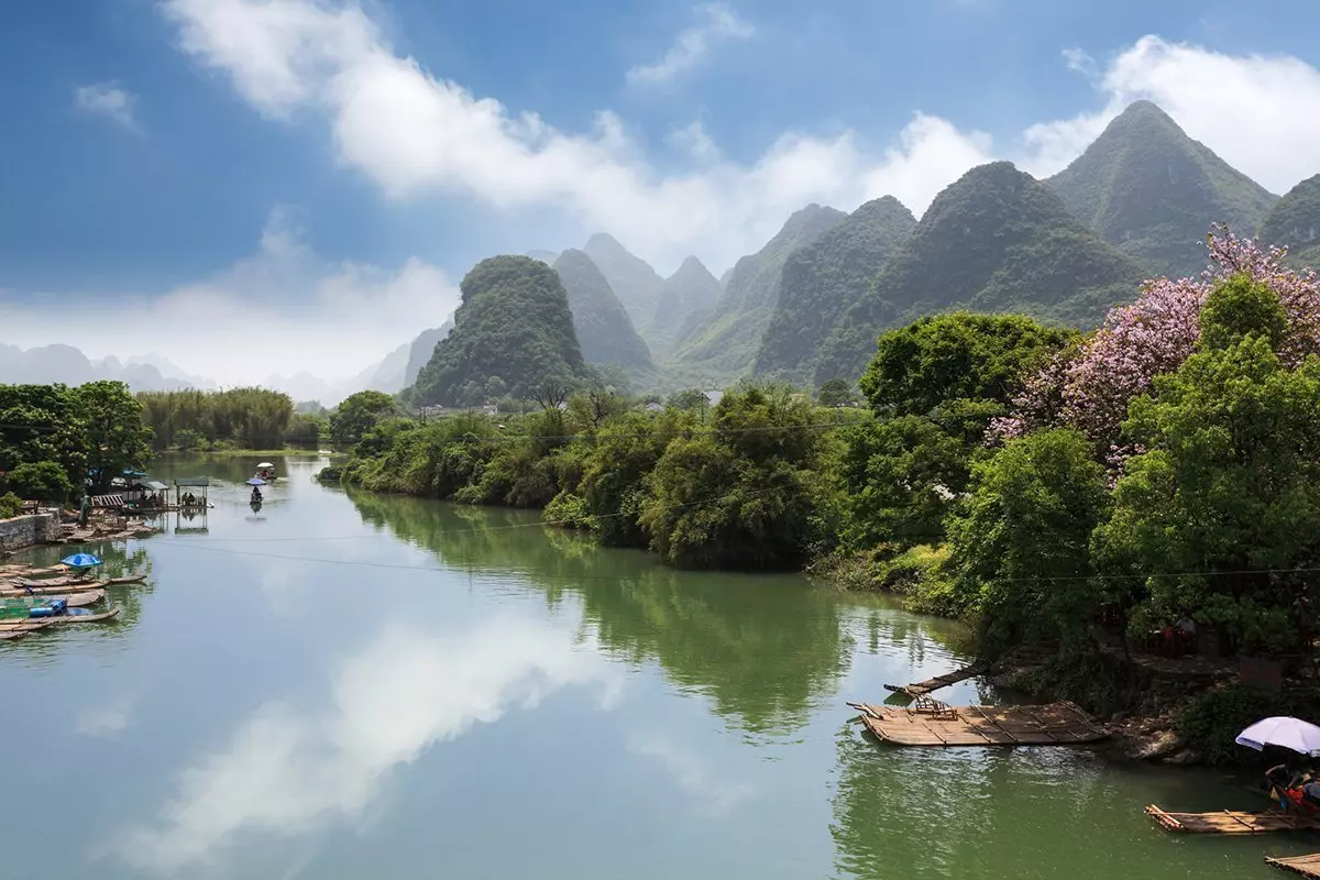 Yangshuo wordt omringd door adembenemende, schilderachtige natuur. Het is haast niet in woorden uit te drukken hoe prachtig Yangshuo en de Li-rivier zijn, die kronkelend door de stad stroomt. Hier vindt u mosgroene kalkstenen bergen en ziet u hardwerkende boeren op hun akkers. U voelt overal een bijzondere rust en ademt frisse, schone lucht in. Het is direct duidelijk waarom deze streek al eeuwenlang schilders en dichters inspireert. Het landschap van Yangshuo wordt zelfs zo gewaardeerd in China dat de Li-rivier, rijstvelden en kalksteenpieken te zien zijn op het biljet van 20 yuan.