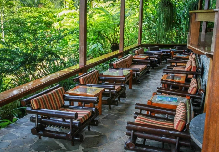 Je ontbijt (inbegrepen) wordt geserveerd in het overdekte restaurant van het hotel, dat ook een geweldig uitzicht biedt op de groene omgeving. Je kunt hier ook de lunch en het diner bestellen. Midden in de weelderige tuin van het hotel ligt het zwembad, waar je een duik kunt nemen of lekker kunt ontspannen op een ligstoel terwijl je geniet van het uitzicht op de indrukwekkende Arenal-vulkaan.