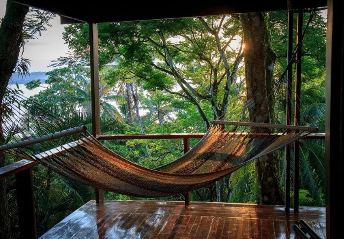 Aan het einde van een avontuurlijke dag kun je genieten van een rustige avond in een hangmat met uitzicht op de baai terwijl de zon langzaam aan de horizon ondergaat.