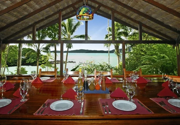 Het restaurant van het hotel, The Great Room, is het natuurlijke sociale hart. Hier worden gerechten bereid met lokale ingrediënten – waarvan een groot deel afkomstig is uit de eigen moestuin van het hotel, La Perla. De keuken zet smaak, kwaliteit en duurzaamheid boven massaproductie, en de maaltijden worden geserveerd in een open eetruimte met uitzicht op de oceaan en het regenwoud.