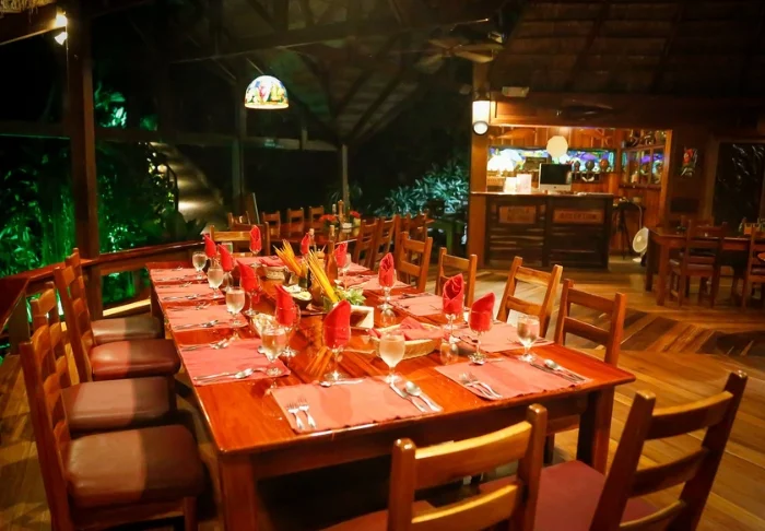 Tijdens je verblijf in Tortuguero zijn je maaltijden inbegrepen in de prijs en worden ze geserveerd als buffet in het restaurant Mambo, dat zich direct bij het zwembad bevindt. Tegen een extra vergoeding kun je een tafel reserveren in Katonga, het drijvende restaurant van de lodge, en middenin het regenwoud van je diner genieten terwijl je langzaam over de kanalen van Tortuguero glijdt (reservering vereist).