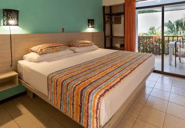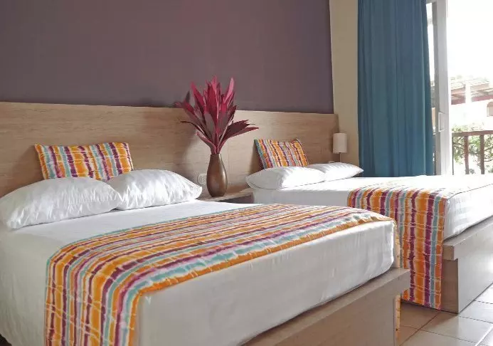 Het hotel is verdeeld over 2 verdiepingen en heeft slechts 24 kamers, die allemaal een privéterras of balkon hebben met uitzicht op de weelderige tuin of een van de twee kleine zwembaden. De kamers hebben heldere kleuren en zijn iets ouder, maar er is alles wat je nodig hebt, zoals een tv, een plafondventilator, airconditioning, een koelkast, een kluis en je eigen badkamer.