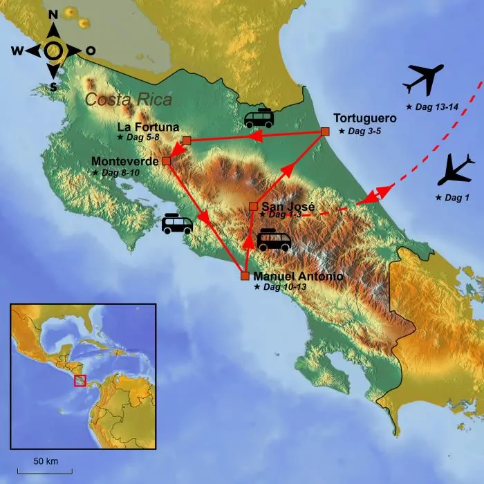 De reis begint in de hoofdstad van Costa Rica, San José. Daarvandaan ga je naar de weelderige jungle van het nationale park Tortuguero. Hier word je omringd door prachtige natuur en interessante wilde dieren, en al het vervoer vindt plaats per boot over de vele kanalen van Tortuguero.