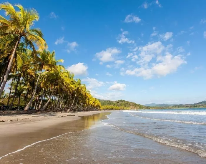 De tour eindigt aan de Pacifische kust van Costa Rica aan het prachtige zandstrand Playa Sámara, omgeven door wuivende palmbomen.