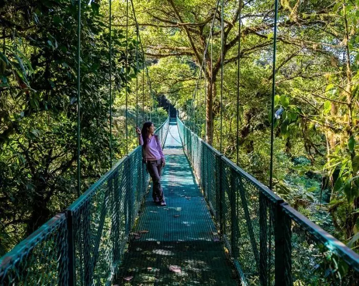Vandaag ervaar je het Monteverde Cloud Forest van bovenaf, waar je een spannende wandeling van 2,5 kilometer over hangbruggen in de boomtoppen wacht. Hierboven kan je de unieke en mysterieuze sfeer van de nevel zien en voelen. Je bevindt je in een sprookjesachtig landschap omringd door grote bomen, varens, orchideeën, mossen en talloze plantensoorten die op de boomstammen groeien.