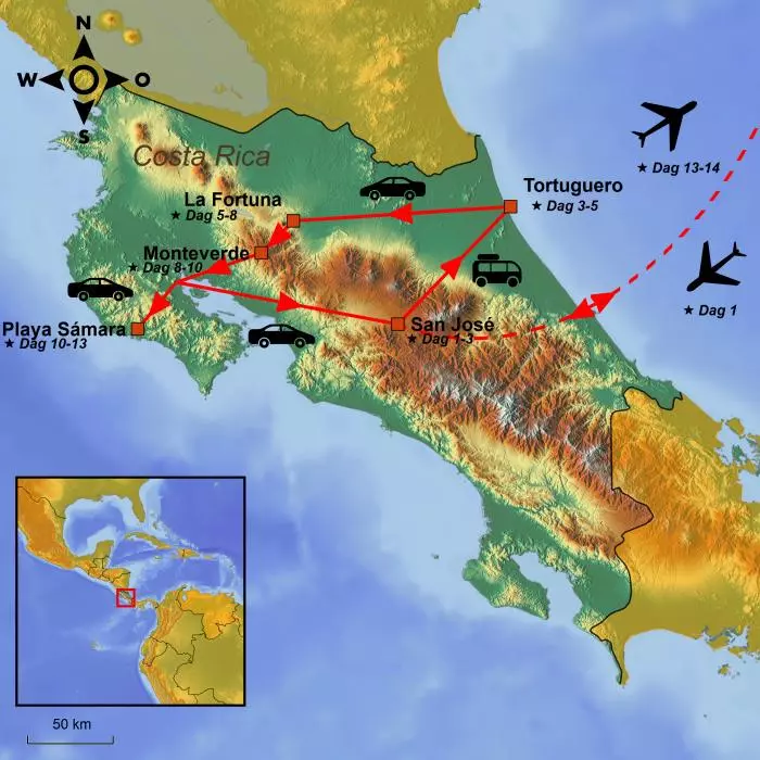 Verken de magische landschappen van Costa Rica in je eigen auto en geniet van nationaal park Tortuguero, de iconische Arenal-vulkaan, het nevelbos van Monteverde en het idyllische strand van Playa Sámara.