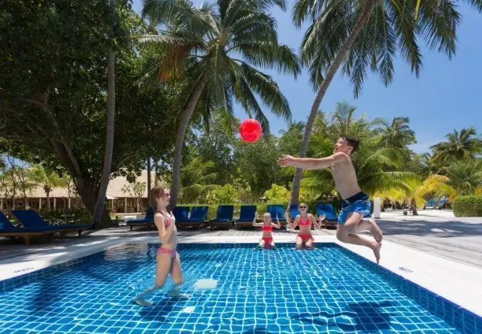 Meeru is verdeeld in twee zones, een speciaal voor stellen en een voor gezinnen met een kinderzwembad en een gezinsvriendelijk restaurant. Zandpaden met wuivende palmbomen en tropische bomen en struiken verbinden verschillende gebieden op het eiland, zodat je niet het hele eiland rond hoeft te lopen om je favoriete restaurant of zwembad te bereiken. Als je de afstanden te groot vindt, kun je een fiets huren of je door de buggy van het eiland laten rijden.