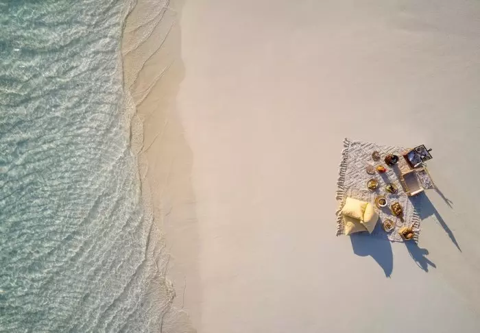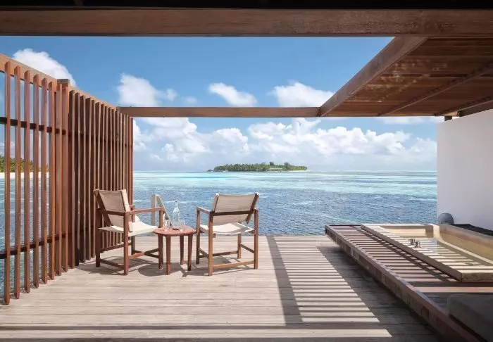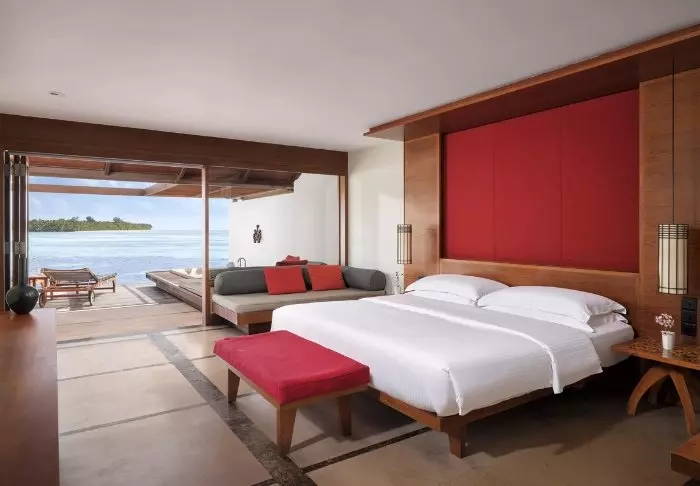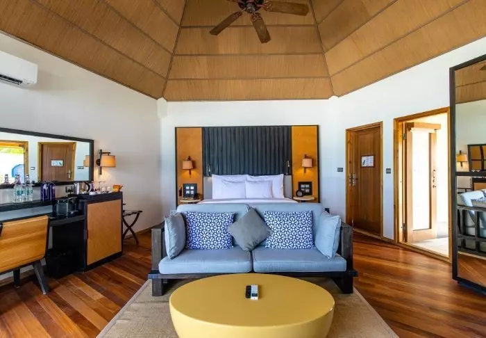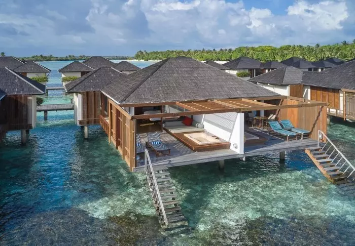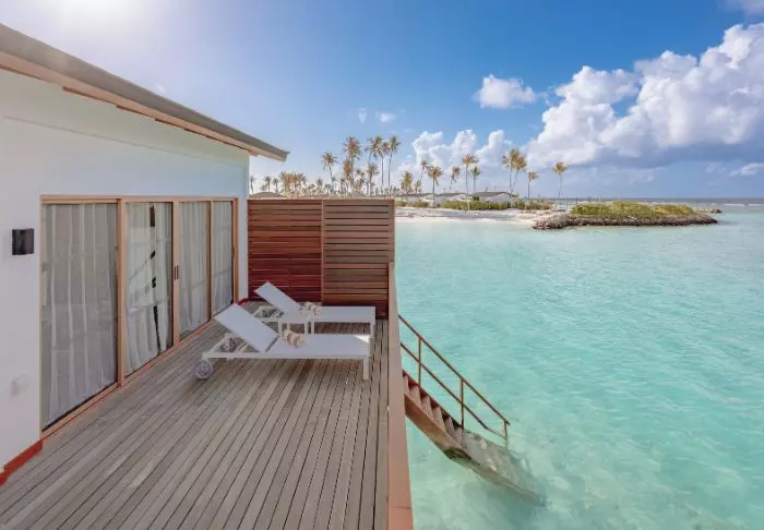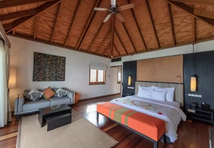 De pier drijft boven het turquoise heldere water en het personeel staat klaar om je te begroeten. Je laat je tenen in het krijtwitte zand zakken en krijgt een welkomstdrankje aangeboden terwijl het personeel je check-in regelt. Daarna word je naar je villa gebracht.