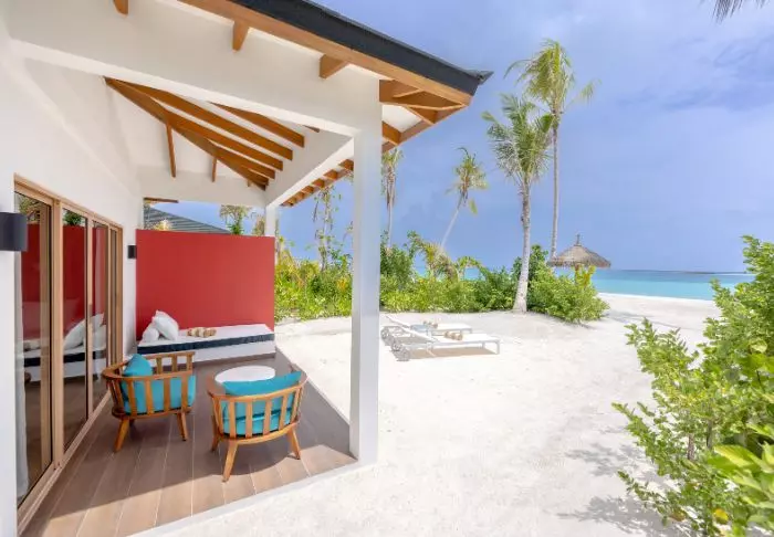 De strandvilla is 54 m2 groot en is geschikt voor 2 volwassenen en 2 kinderen of 3 volwassenen. De strandvilla is licht en ruim en ingericht met traditionele houten meubels en kleurige stoffen. Elke villa heeft airconditioning, plafondventilator, wifi, minibar, tv, telefoon en waterkoker voor thee en koffie, en een make-up tafel/bureau. Er is zowel een binnen- als buitenbadkamer met in de ene een ligbad en in de ander een ’open air’ douche. De villa heeft een eigen veranda met stoelen en bijbehorende ligstoelen en vanaf hier is er direct toegang tot het krijtwitte zandstrand.