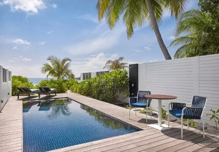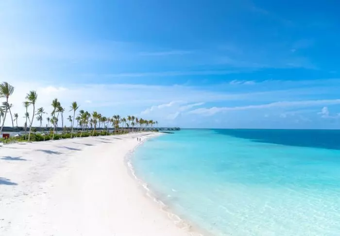 Het eiland wordt omgeven door een prachtige turquoise lagune en een bijna oogverblindend wit zandstrand, waar je vanaf je privéligstoel kunt genieten van de zeebries. Je kunt ook direct vanaf het strand gaan zwemmen en snorkelen tussen kleurrijke vissen en schildpadden. In 2016 is Meeru gestart met het ‘Coral Garden’-project, met als doel het herplanten van koraal in de lagune rond Meeru na een koraalverbleking van de koraalriffen van de Malediven. Het resultaat is goed zichtbaar in het heldere water.
