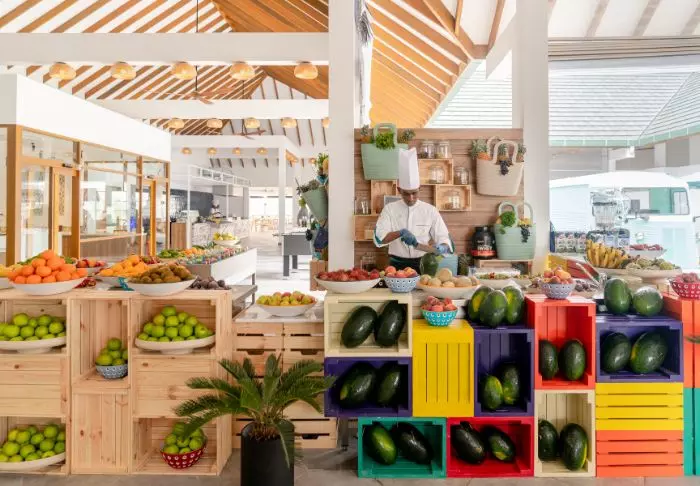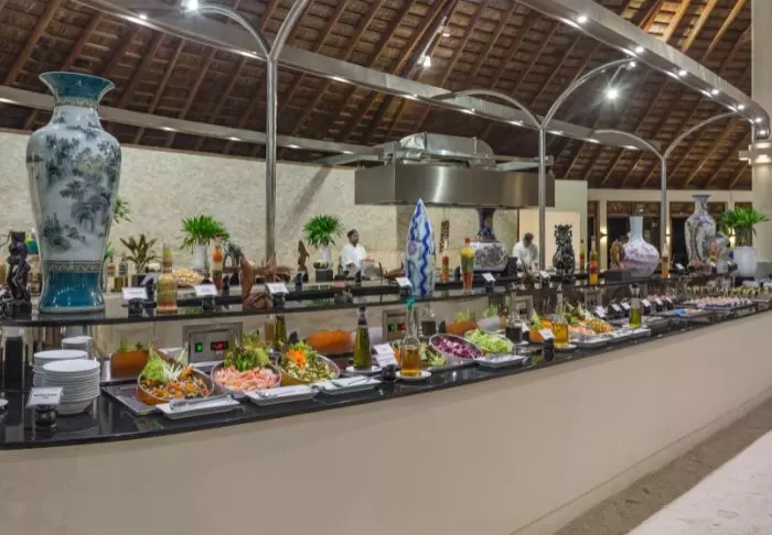 Op het eiland vindt u drie eetgelegenheden: het hoofdrestaurant The Market, in openlucht markt-stijl, biedt een brede keuze aan gerechten van over de hele wereld. Elke dag zijn er verschillende thema’s die uw smaakpapillen zullen verwennen. Daarnaast is er de Italiaanse pizzeria Il Basilico, die verschillende Italiaanse gerechten maakt, en tenslotte bar-restaurant Chiringuito, waar grillgerechten worden geserveerd.
