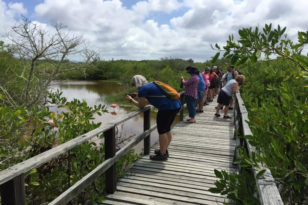 In de middag gaat u op excursie naar enkele hoogtepunten van Isabela. De rondreis begint met een bezoek aan het Arnaldo Tupiza Tortoise Breeding Centre, net buiten de stad. Hier werken vrijwilligers om de populatie reuzenschildpadden op het eiland te vergroten, en kunt u honderden schildpadden van alle maten zien. Uw gids neemt u ook mee naar een fascinerend moerasgebied, waar u vogels zoals steltlopers, waterhoentjes en witwangfluiteenden kunt spotten, samen met de prachtige flamingo’s.