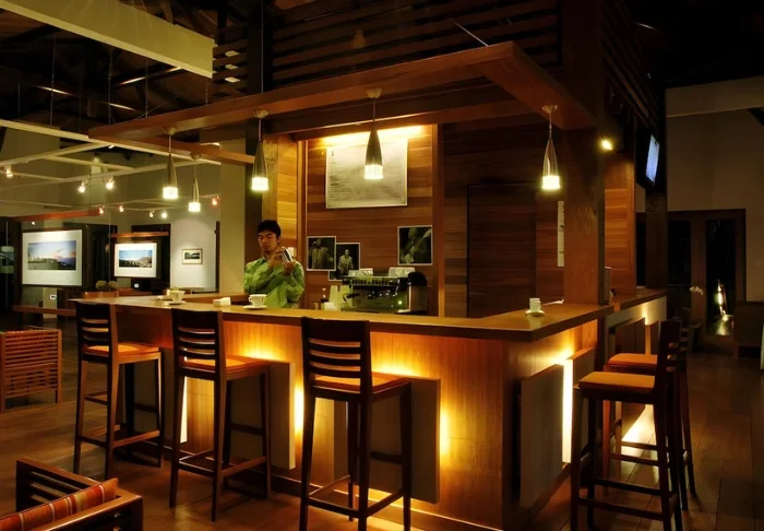 Het resort valt op door zijn elegante en harmonieuze stijl, die een prachtige aanvulling vormt op de schilderachtige omgeving. De plek wordt omgeven door weelderige, tropische tuinen en creëert een rustgevende sfeer met het geluid van kabbelende golven en vogelgezang, wat bijdraagt aan een charmante en ontspannen omgeving.