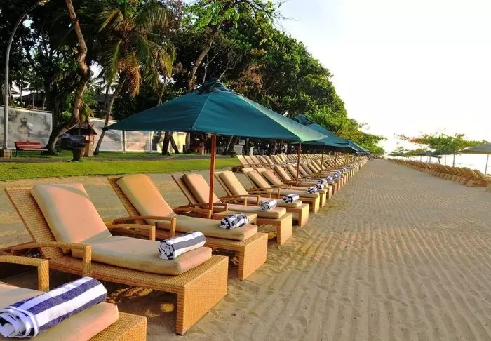 Op het strand kunt u vrij gebruik maken van de ligstoelen en parasols, zodat u heerlijk kunt ontspannen en genieten van de Indonesische warmte.