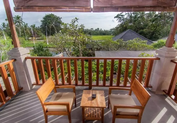 Het hotel heeft een heerlijk zonneterras met ligstoelen, een zwembad en een kleiner kinderbad. Hier kunt u relaxen en opladen terwijl u geniet van het uitzicht op de rijstvelden, de hoge palmbomen, de tropische bomen en de planten.