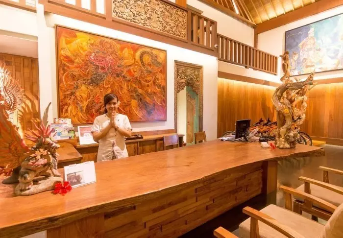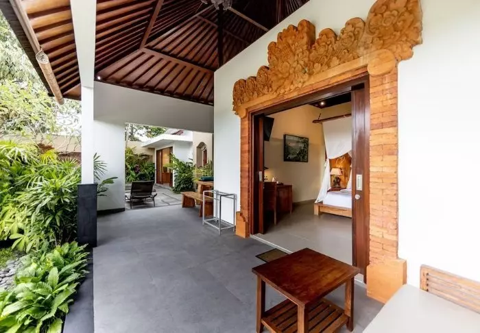 Het kleine hotel is gebouwd in traditionele Balinese stijl met natuurlijke materialen die de groene omgeving prachtig aanvullen.