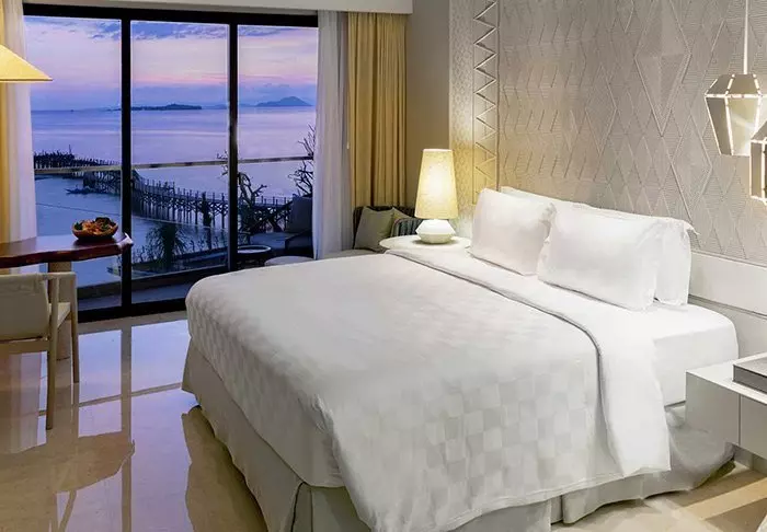 De 205 kamers van het resort zijn stijlvol en modern ingericht met meubels in lichte kleuren, die perfect passen het natuurlijke licht dat binnenvalt via de grote ramen. Elke kamer is minimaal 43 m2 en heeft een eigen balkon, vanwaar u kunt genieten van het fantastische uitzicht op zee en de gouden kleuren van de zonsondergang. Alle kamers zijn voorzien van airco, wifi, tv, inloopkast, minibar en thee- en koffiefaciliteiten. De badkamer is ingericht met een separate regendouche en een ligbad en er is een föhn.