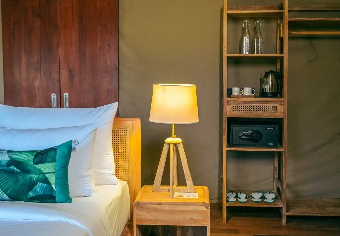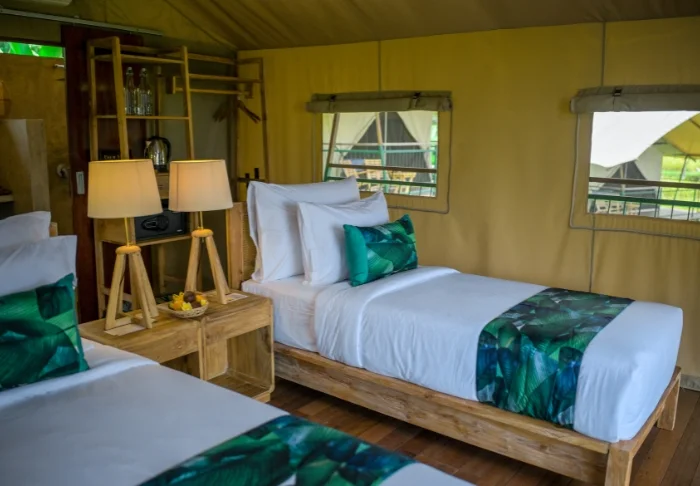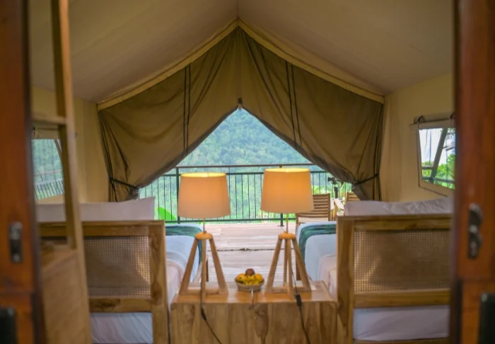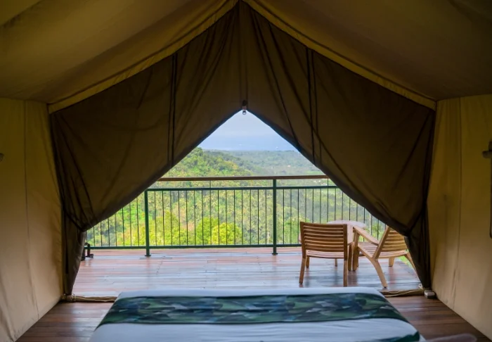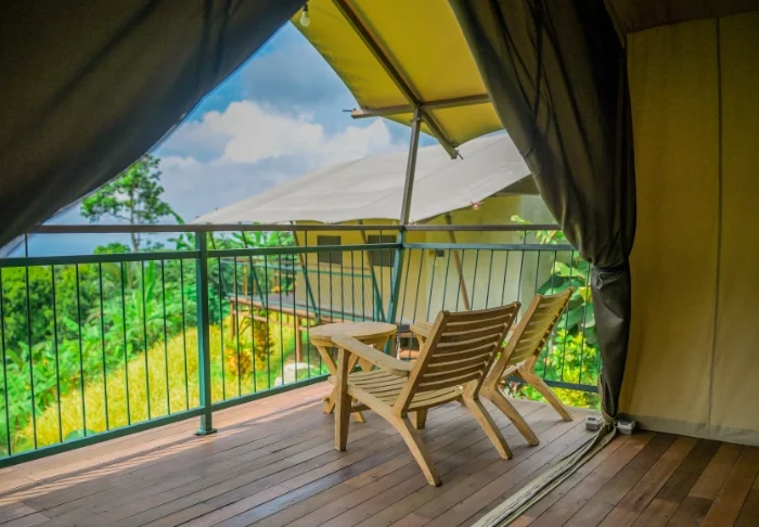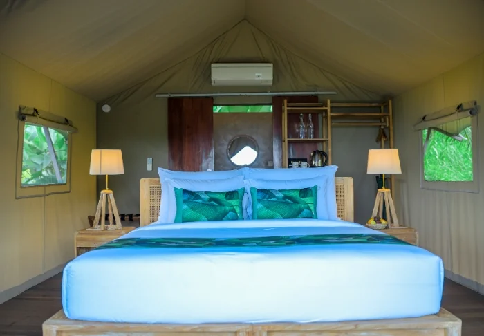 Het resort bestaat uit 22 vrijstaande paviljoens, gelegen op kleine terrassen met uitzicht op de vallei of de zee. De interieurs zijn licht en eenvoudig, met natuurlijke materialen zoals hout en geweven textiel. Sla het doek open en de ruimte vloeit over in de natuur; stap zo uw eigen terras op en voel u volledig opgenomen in het landschap. Standaard verblijft u in een tweepersoons paviljoen, met 25 m² aan binnenruimte en een terras van 10 m². Alle paviljoens beschikken over airconditioning, wifi, een kluis en een badkamer met toilet, douche, warm water en lokaal vervaardigde badproducten.