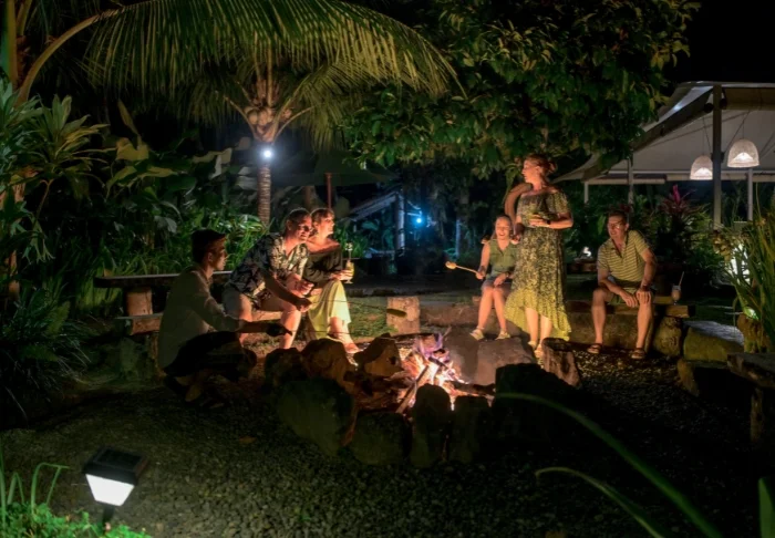 Tegen de avond ontstaat er vaak een ongedwongen sfeer rond de open vuurplaats, met een verfrissende cocktail in de hand, terwijl de cicaden en de gloed van de vlammen de toon zetten voor de rest van de avond.