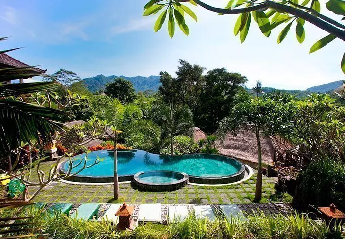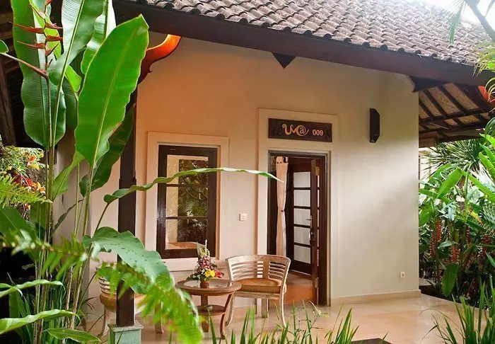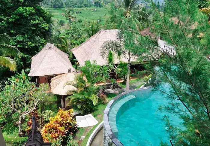 Het hotel heeft een heerlijk zonneterras met ligstoelen, een zwembad en een kleiner kinderbad. Hier kunt u relaxen en opladen terwijl u geniet van het uitzicht op de rijstvelden, de hoge palmbomen, de tropische bomen en de planten.