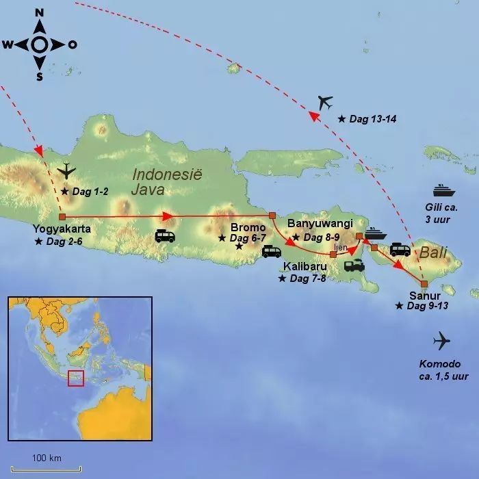 Java ligt op de Indonesische `ring van vuur’, een reeks van de meest actieve vulkanen ter wereld. Overal op Java vindt u fascinerend landschap met prachtige, bijna blauwgroene rijstvelden met de iconische vulkanen op de achtergrond. U bezoekt dorpen en steden van honderden jaren oud, sommige met geplaveide straatjes en steegjes, andere verborgen achter dikke, 20 meter hoge bamboe. En daartussen ligt de indrukwekkende Borobudur, een van de grootste en allermooiste boeddhistische heiligdommen ter wereld. Niet ver hier vandaan ligt ook Prambanan, het prachtige hindoeïstische tempelcomplex. U bezoekt de actieve Bromo vulkaan en loopt over de legendarische `zandzee´ naar de vulkaan. Op uw reis op Java ontdekt u kruiden-, koffie- en theeplantages, de contrasten tussen de traditionele en moderne manier van leven en een uiterst vriendelijke inwoners. De kers op de taart zijn een paar relaxte dagen op de prachtige stranden van Sanur op Bali.